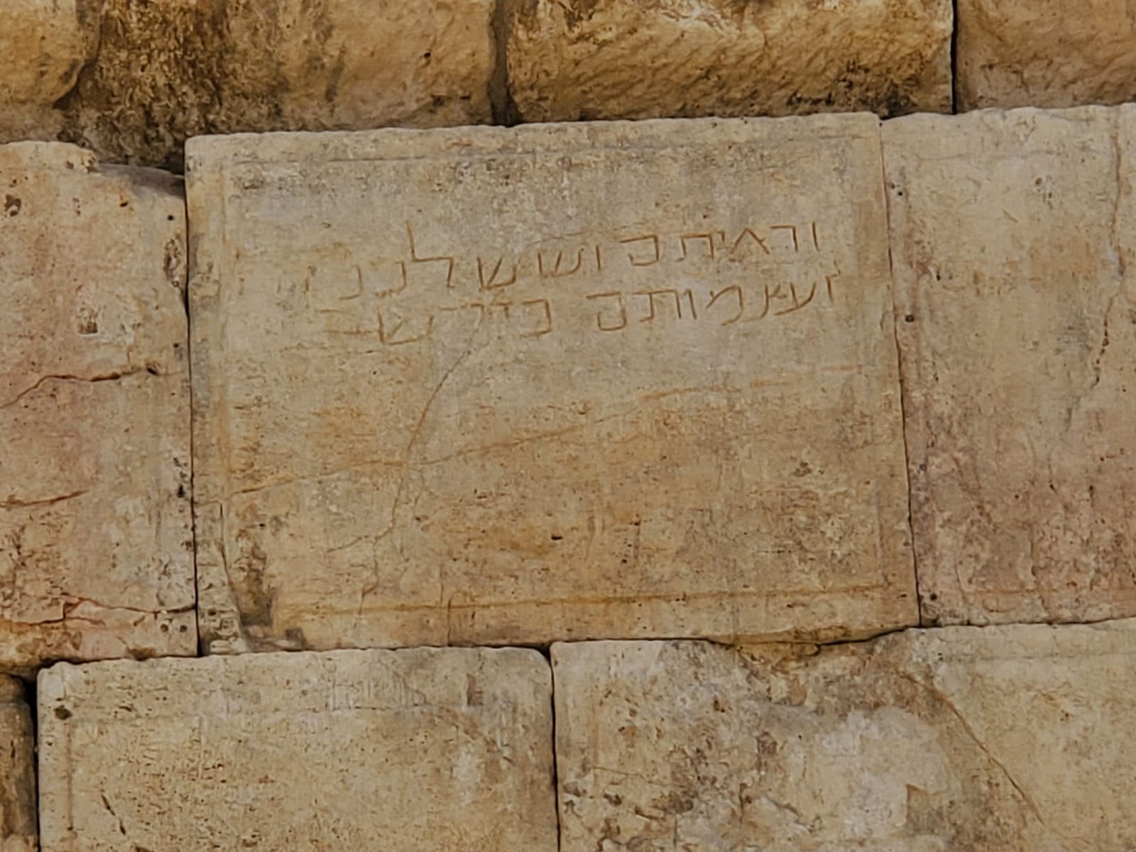 בתמונה: כתובת שהתגלתה על אחת מאבני הכותל המערבי מצטטת בשינויים אחדים פסוק מספר ישעיהו סו, יד (לשון הכתובת: "וראיתם ושש לבכם ועצמותם כדשא…"). יש הסבורים כי הכתובת נחקקה על ידי יהודי נרגש ששמע על יוזמתו של הקיסר לשקם את בית המקדש.