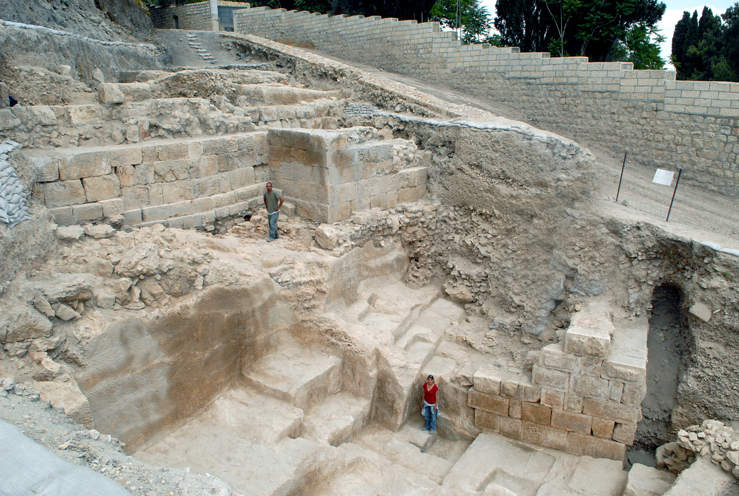 בתמונה: במאה ה-5 לספירה שיקמה המלכה הביזנטית אוודוקיה את חומת ירושלים. שרידי החומה התגלו במקומות אחדים, ובכללם על המורדות הדרומיים של הר ציון. הארכיאולוג ד"ר יוחנן זלינגר גילה את שרידי החומה בתוואי שבו התגלתה גם חומת העיר מימי הבית הראשון וחומת העיר מימי הבית השני.